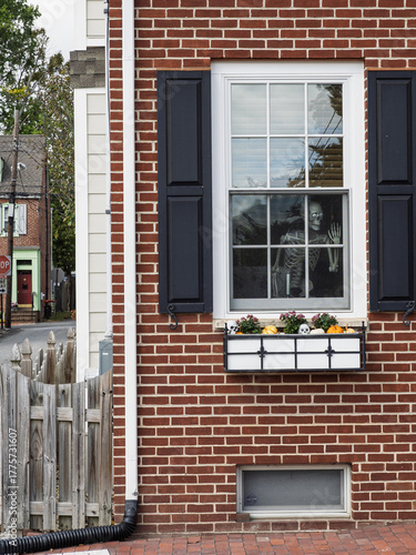 Fototapeta premium Skeleton Halloween decoration in house window New Castle Delaware
