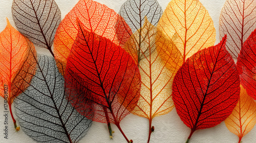 © Lazartivan, Obraz premium Skeleton Leaves with Intricate Vein Patterns in Red Orange Yellow Autumn Colors
