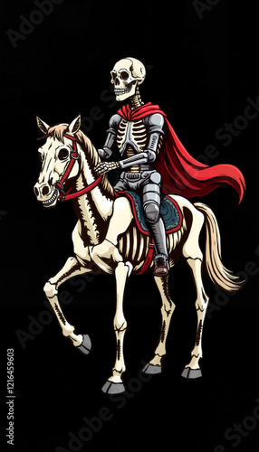 Fototapeta premium Skeleton rider on horse in red cape against black background