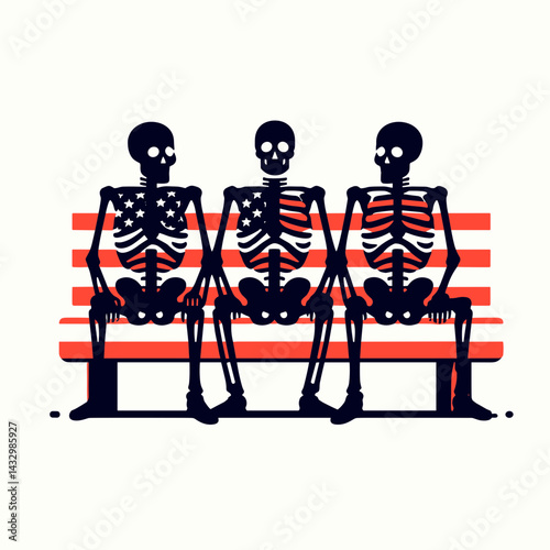 © Lovicora, Fototapeta premium skeleton wear american flag Sitting together on a bench. Funny Animal Vector Clip art. Bony figure attire patriotic banner resting jointly upon outdoor seat.