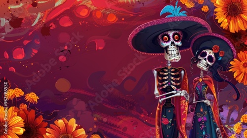 © Дмитрий Баронин, Obraz premium Skeletons in sombrero hats. Day of the Dead or Dia De Los Muertos Mexican holiday characters Katrina, skeletons and mariachi musicians.