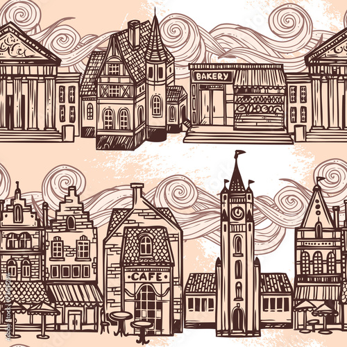 © Macrovector, Fototapeta premium Sketch city seamless border black and white
