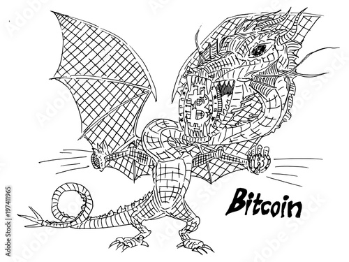 © antondzyna, Fototapeta premium sketch dragon with a coin of crypto currency in the teeth