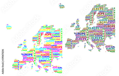 © danlersk, Naklejka premium Sketch Europe letter text continent, Europe word - in the shape of the continent, Map of continent Europe - color vector illustration