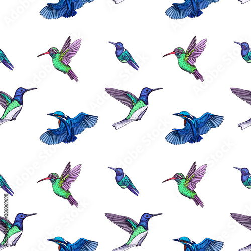 © mary, Obraz premium Sketch hand drawn pattern with hummingbird. Animals illustration colibri birds.