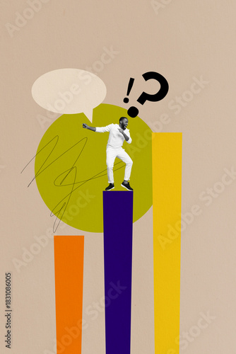 © deagreez, Fototapeta premium Sketch image artwork composite 3D photo collage of young man talk speech cloud question charts graphics trader success goal business