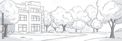 © LyceeChee, Obraz premium Sketch of a Building and Lush Green Trees