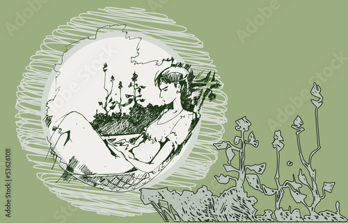 © Pona, Obraz premium Sketch of a girl in a hammock