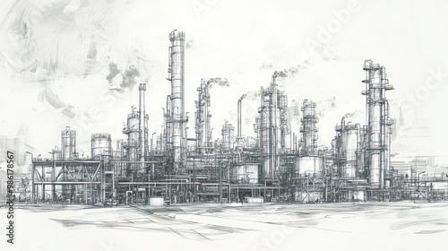 Obraz premium Sketch of a large industrial complex with tall towers and intricate piping,...