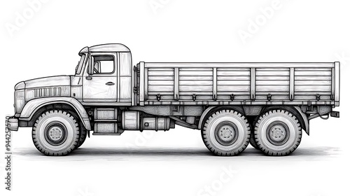 © Helois, Fototapeta premium Sketch of a large truck with a flatbed, drawn in pencil on a white background.
