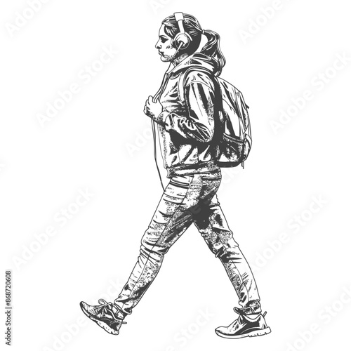 © NikahGeh, Fototapeta premium Sketch of a Walking Woman with Backpack and Headphones