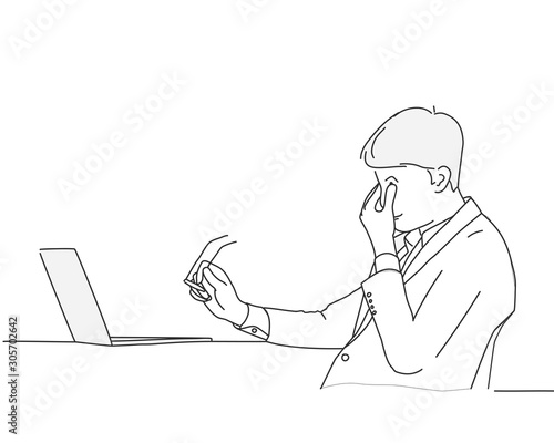 © Anna, Fototapeta premium Sketch of businessman feeling sick and tired. Line drawing vector illustration.