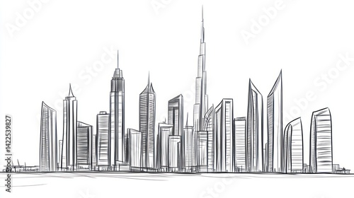 © Mundhut, Naklejka premium Sketch of Dubai Skyline, Urban Landscape, Architectural Drawing, Background Use
