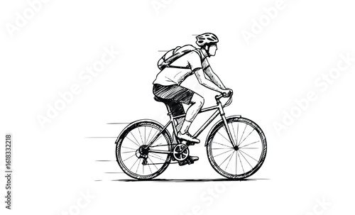 © Mr. Stocker, Fototapeta premium Sketch of young caucasian male cyclist riding bike fast with helmet and backpack. Vector retro hand drawn illustration