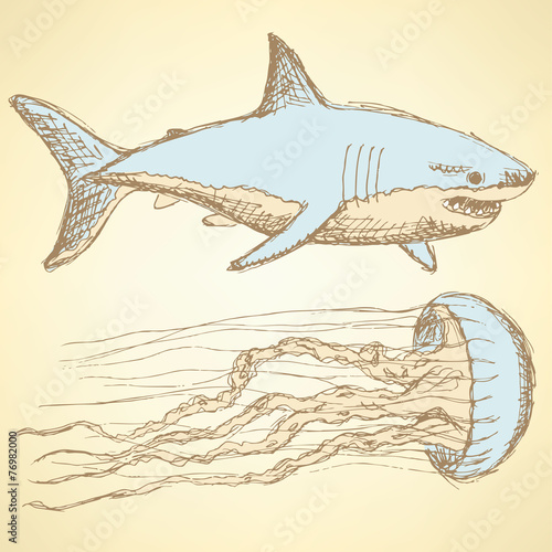 © kali1348, Fototapeta premium Sketch shark and jellyfish in vintage style