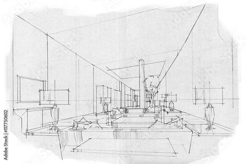© last19, Fototapeta premium sketch stripes living VIP room, black and white interior design.