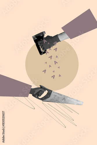 © deagreez, Naklejka premium Sketch vertical poster image collage of hands pour letters non-verbal communication speech bookworm hobby writer student learn