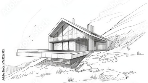 Fototapeta premium Sketched Concept of Mountain House, Architectural Line Art Illustration,...