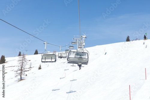 © HelgaQ, Obraz premium Ski lift on snowy mountain under clear blue sky on winter day