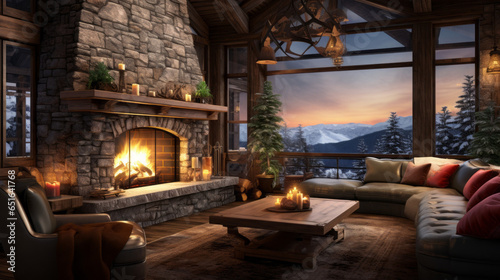 Fototapeta premium Ski Resort Getaway A room inspired by ski resort lodges, featuring a stone fireplace, wooden accents, and cozy seating for après-ski relaxation
