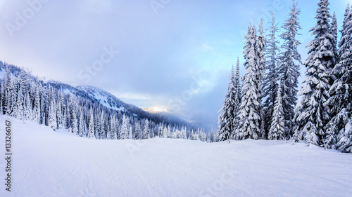 © hpbfotos, Fototapeta premium Ski Slopes and a Winter Landscape with Snow Covered Trees on the Ski Hills near the village of Sun Peaks in the Shuswap Highlands of central British Columbia, Canada