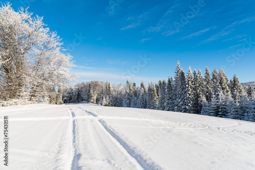 Obraz premium Ski track in winter landscape, Beskid Sadecki Mountains, Poland
