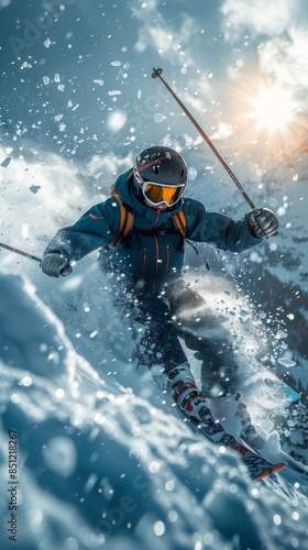 © Wayu, Naklejka premium Skier in mountains, prepared piste and sunny day