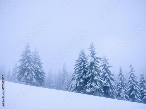 Naklejka premium Skiers gracefully ski through a snowy forest surrounded by fog, creating a serene winter scene, trees, peaceful, tranquil