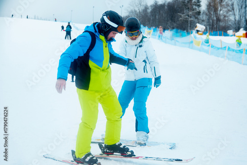 Fototapeta premium Skiing lessons with a professional instructor on a snowy slope during winter...