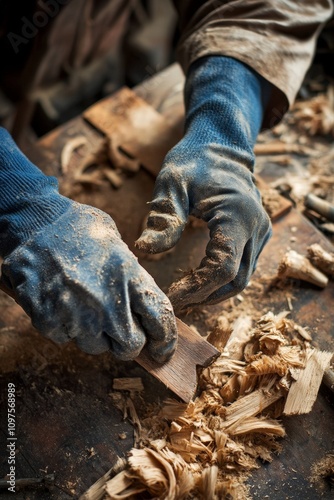 © felix_brönnimann, Obraz premium Skilled Carpenter Shaping Wood: Close-Up of Hands in Blue Gloves Working with Shavings and Tools on Rustic Workbench
