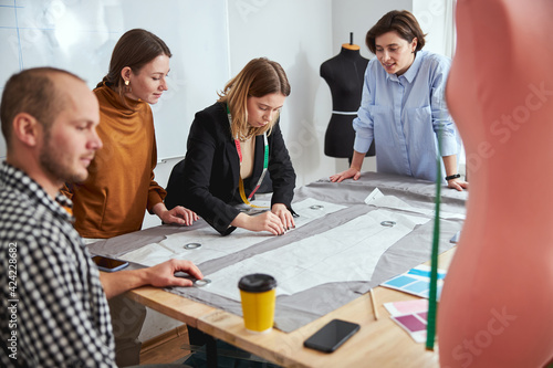 Fototapeta premium Skilled tailors watching their colleague using patterns