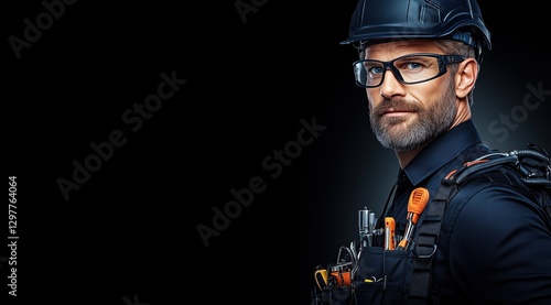 © Anna, Fototapeta premium skilled worker wearing a hard hat and protective glasses stands confidently, showcasing various tools attached to his safety vest, illustrating readiness for work in a low-light environment