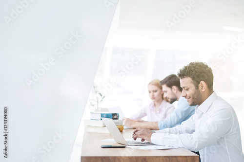 © Yakobchuk Olena, Fototapeta premium Skillful three workers are using a computer