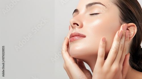 Obraz premium skin care. Beautiful woman touching healthy facial skin portrait. Beautiful...