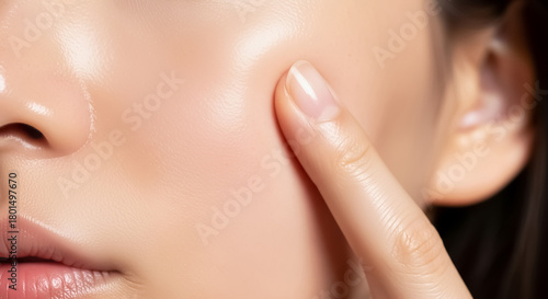 Obraz premium Skincare portrait Caucasian woman touching cheek with glowing skin