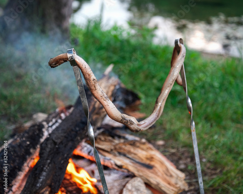 © Ambartsumian, Obraz premium skinless snake carcass baked on a bonfire put on skewers