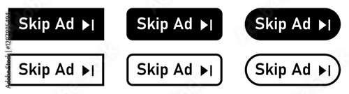 © Munnacreativehub, Obraz premium Skip ad buttons vector icon set in black color. Skip advertisement icons. Skip ad button for website. Silhouette and line style. Vector illustration.