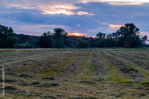 Fototapeta premium Skoszona łąka w promieniach zachodzącego słońca