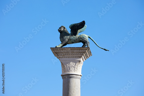 Obraz premium Skrzydlata lew statua, symbol Wenecja w słonecznym dniu, niebieskie niebo w Włochy