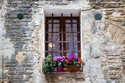 © arekzet62, Naklejka premium Skrzynki kwiatów pod oknem w starym domu