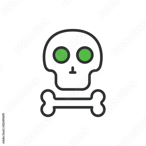 © Bezvershenko, Fototapeta premium Skull and bone, in line design, green. Skull, Bone, Skeleton, Death, Crossbones, Danger, Pirate on white background vector. Skull and bone editable stroke icon.