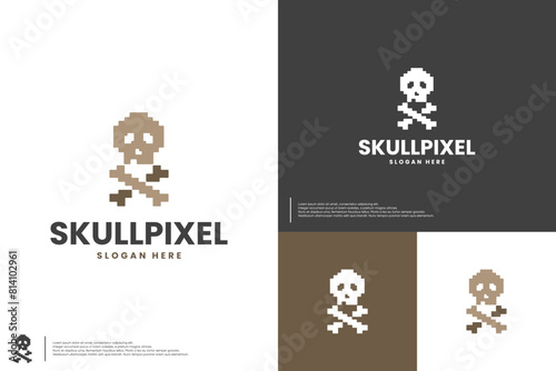 Obraz premium skull head logo in 8 bit style, tech pixels, logo design template.