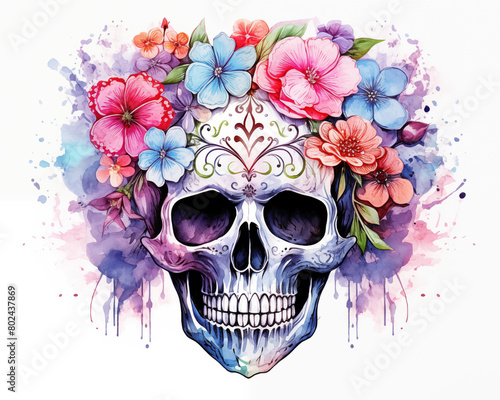 Fototapeta premium Skull in flowers. Watercolor drawing. White back