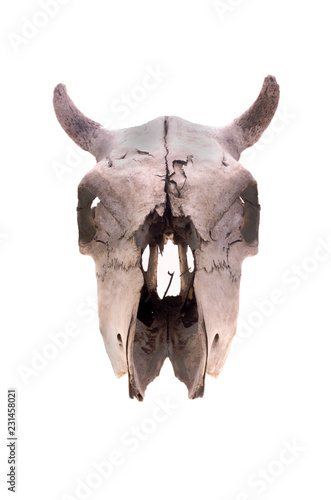 © Kyrylo, Obraz premium Skull of a cow in a front view isolated on white. Short skull horns.