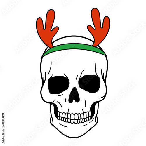 Fototapeta premium Skull Santa. Deer antlers. Scary Christmas Skull. Horror Christmas. Vector illustration. Isolated on white background.