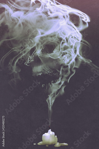 Naklejka premium skull shaped smoke comes out from burnt candle,horror concept,illustration painting