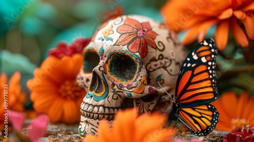 © Marco, Fototapeta premium skull with a butterfly decorated for the day of the dead Mexico