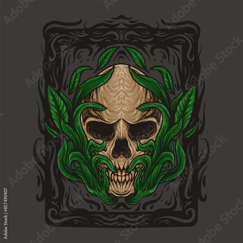 © ainadhon, Fototapeta premium skull with leaf ornament vector illustration