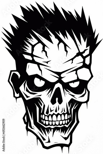 Fototapeta premium Skull with spiked hair and spiked eyes is shown in black and white.