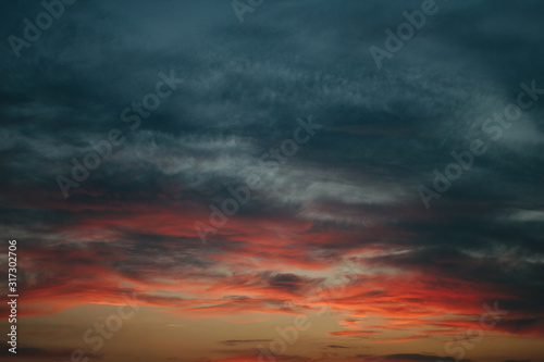 Obraz premium Sky at sunset, gray red clouds closeup background texture